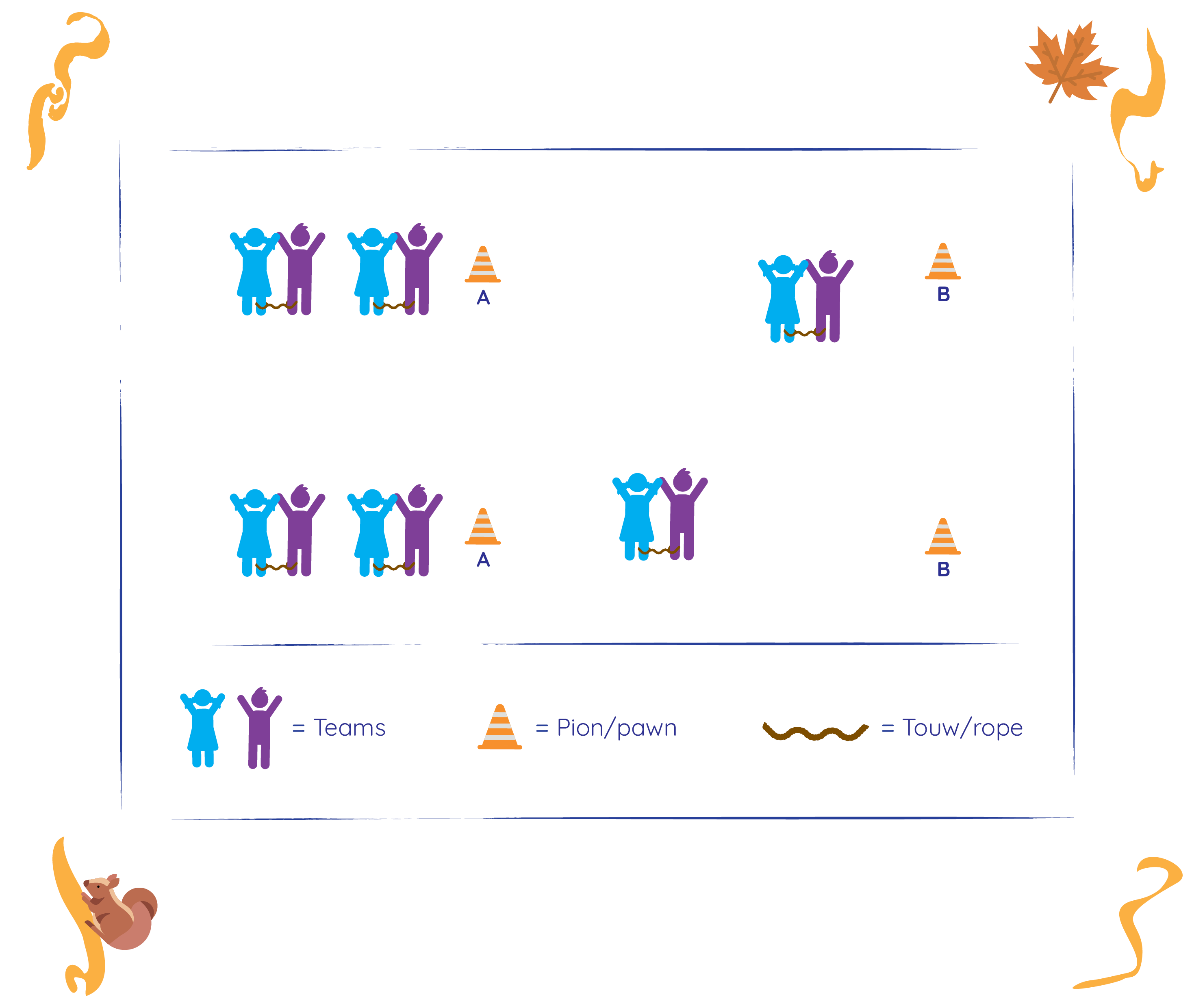 Per tweetal worden de benen van de spelers aan elkaar vastgemaakt (linkerbeen van speler 1 en rechterbeen van speler 2). Het tweetal legt zo snel mogelijk samen het parcours van pionnen af. Wanneer het tweetal weer terug bij het startpunt is, mag het volgende tweetal beginnen. Afhankelijk van het aantal spelers kun je 2 teams maken met elk een eigen parcours of de tijd van elk tweetal los meten.